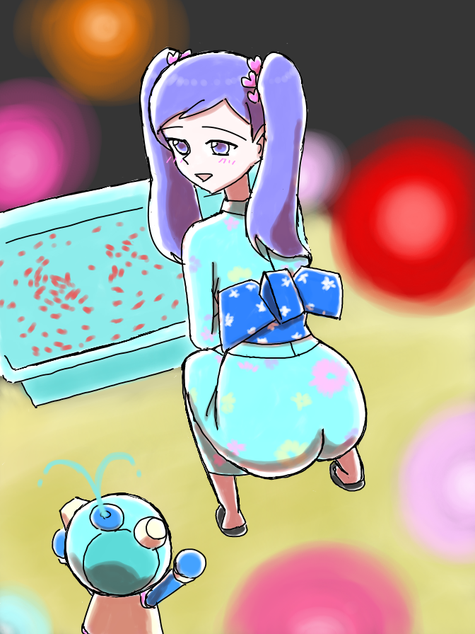 うお~さんより頂いた2025年度の暑中見舞い絵で、クロビー神社にてコピーロイドで実体化したアクアマンと金魚すくいを楽しむ浴衣舟子です。