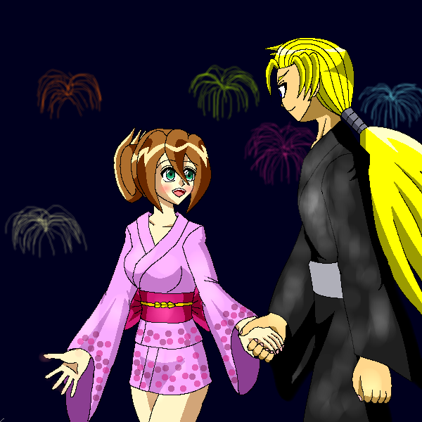 花火を背景にゼロと浴衣デートをするアイリスです。